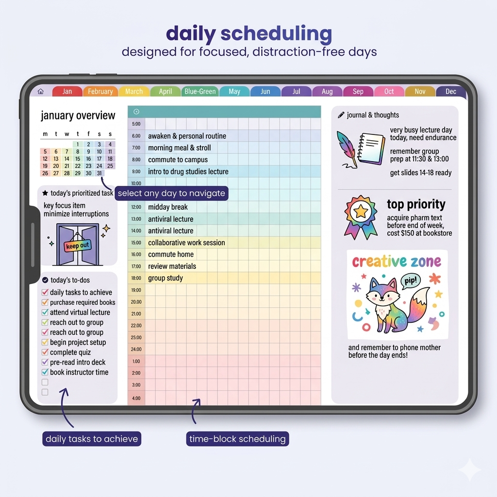 Built for real life, it supports your workflow from big-picture monthly vision all the way down to focused daily execution. Whether you’re studying, working, or balancing both, the clean layouts help you stay organized without feeling overwhelmed.