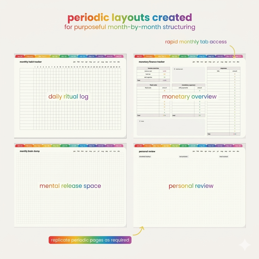 - Monthly habit trackers, finance trackers, reflection pages & brain dumps